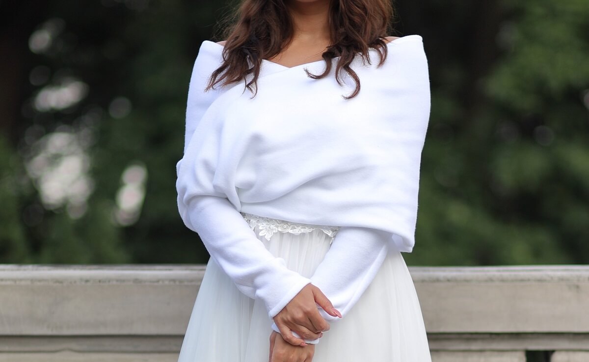 Гладкий флисовый свадебный вырез облегает тело и подходит к любому стилю платья, не нарушая его характера. Перекрещенный на груди материал эффектно подчеркивает фигуру невесты и позволяет подогнать наряд под свои нужды. Вы можете накинуть его на плечи или более плотно прикрыться от шеи до талии.