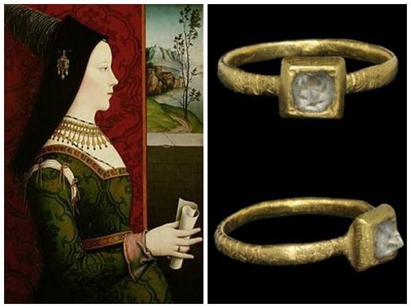 Первым самым известным обручальным кольцом, упомянутым в европейских исторических источниках, было кольцо, подаренное Марии Бургундской Максимилианом I в 1477 году. Эта знатная дама, которая по своему происхождению была лучшей тусовкой в этой части света, со дня своего рождения получала предложения руки и сердца от потомков мужского пола самых именитых семей Европы того времени. Наконец — после многих династических перипетий — в 19 лет она вышла замуж за Максимилиана Габсбурга, будущего императора Германской империи. О самом кольце следует сказать, что это был первый помолвочный бриллиант, уникальная редкость на ювелирных рынках того времени, положивший начало особой моде на кольца с бриллиантами среди коронованных особ и аристократических родов Западной Европы.
