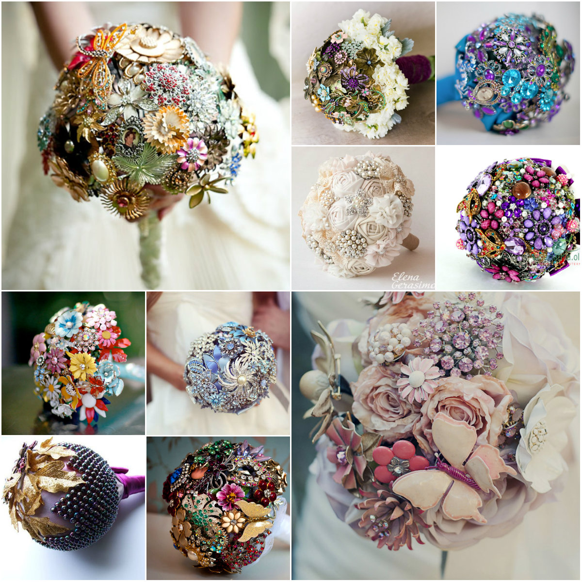 Каждый букет брошей индивидуален и поэтому очень индивидуален. Здесь многое зависит от мастерства художника (некоторые букеты из брошей – настоящие произведения прикладного искусства), который раскладывает броши на решетке, как пазлы, а эти не всегда хотят соответствовать друг другу. В букет можно прикрепить собственные украшения, семейные сувениры и символы – не только броши, но и кольца, серьги, даже элементы часов или различные мелкие аксессуары. Есть букеты, которые не только украшают, но и рассказывают личные истории своих обладательниц. Они идеально подходят для подарка от пожилой невесты. И невеста может передать его своей дочери годы спустя.