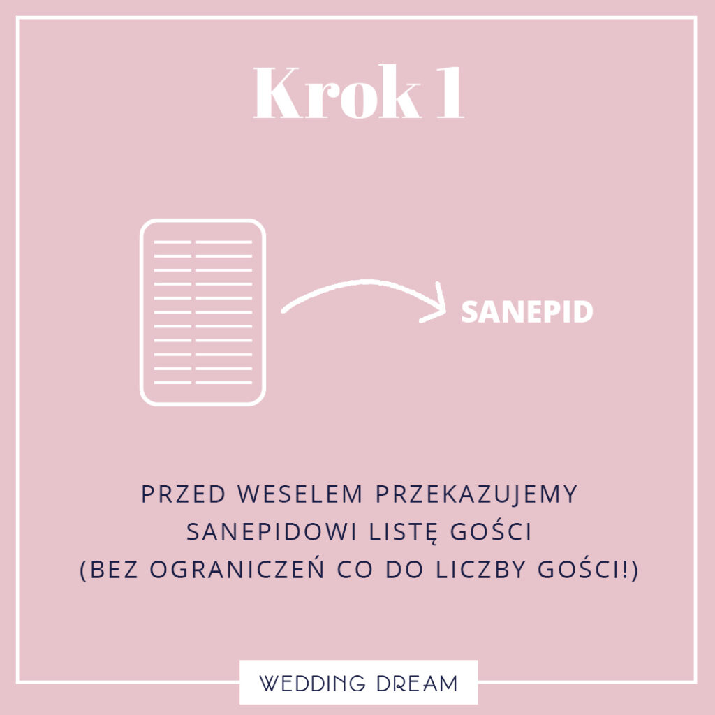 Каждый из вас наверняка создал его при подготовке к свадьбе. Чтобы было легче в случае инфекции идентификация всех потенциально облученных лиц перед церемонией его следует отправить в Санэпиду. Главное, чтобы в нем были имена всех людей, которые будут с вами в зале во время свадьбы: диджей, группа, фотограф. Точно так же имена людей из службы свадебного зала должны быть сообщены в Санэпиду владельцем учреждения. Благодаря этому, даже если на вечеринку придет больной человек будет легче связаться с другими, которые затем должны быть помещены в карантин.