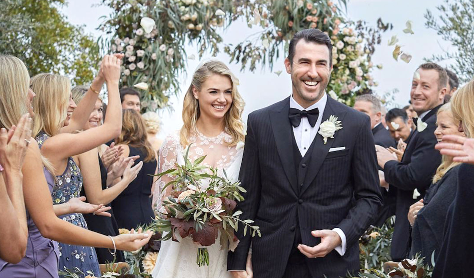 Кейт Аптон и ее возлюбленный Джастин Верландер поженились в ноябре 2017 года в Италии. Перед организацией мероприятия Кейт сказала, что мечтает об этом чувствовать себя в отпуске во время свадьбы с самыми близкими родственниками и друзьями. Церемония прошла в красивом поместье, которое декораторы превратили в сказочную страну. Много зелени, георгины и розы нежных оттенков, плюс оливковые ветки и ягоды. Аллея, по которой гуляла молодая пара, была усыпана лепестками роз. Атмосферу Тосканы дополняет красивая бело-голубая посуда на свадьбе.