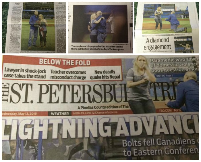 И что еще я могу добавить? Совершенно застигнутая врасплох, Мелисса как-то пробормотала «да», а потом даже смогла бросить мяч, который в итоге пришел на стадион Tampa Bay Rays, чтобы бросить перед 10 000 фанатов бейсбола… 🙂 «Так удивлена, так сильно влюблена – Я чувствую себя на седьмом небе от счастья!» – написала она в Facebook как счастливая невеста.