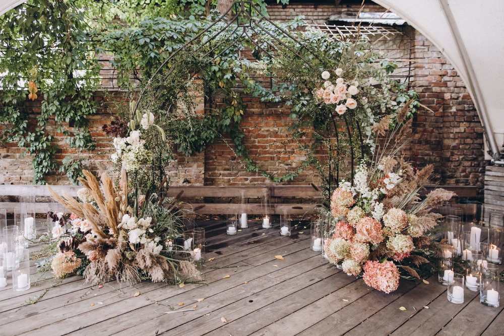 Самое главное, чтобы все это гармонировало со свадебным залом. Поэтому, прежде чем выбрать, например, лесную концепцию в свадебном убранстве, убедитесь, что вы выбираете комнату в стиле бохо, а не гламур.