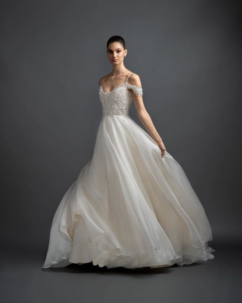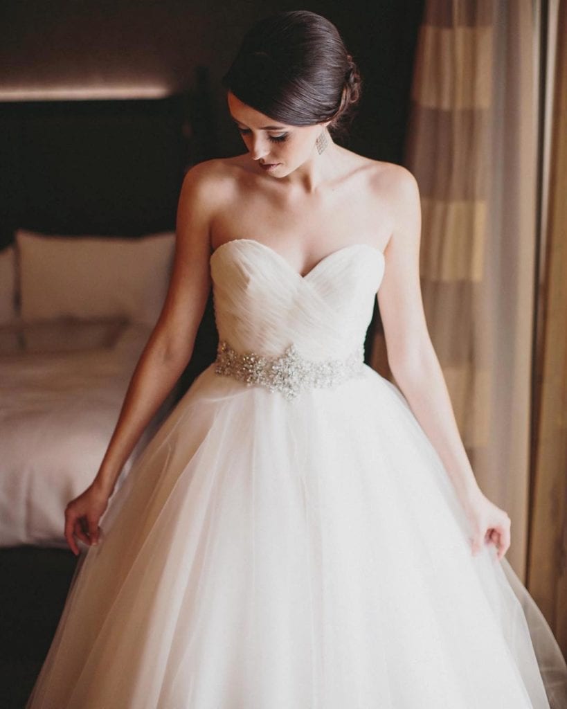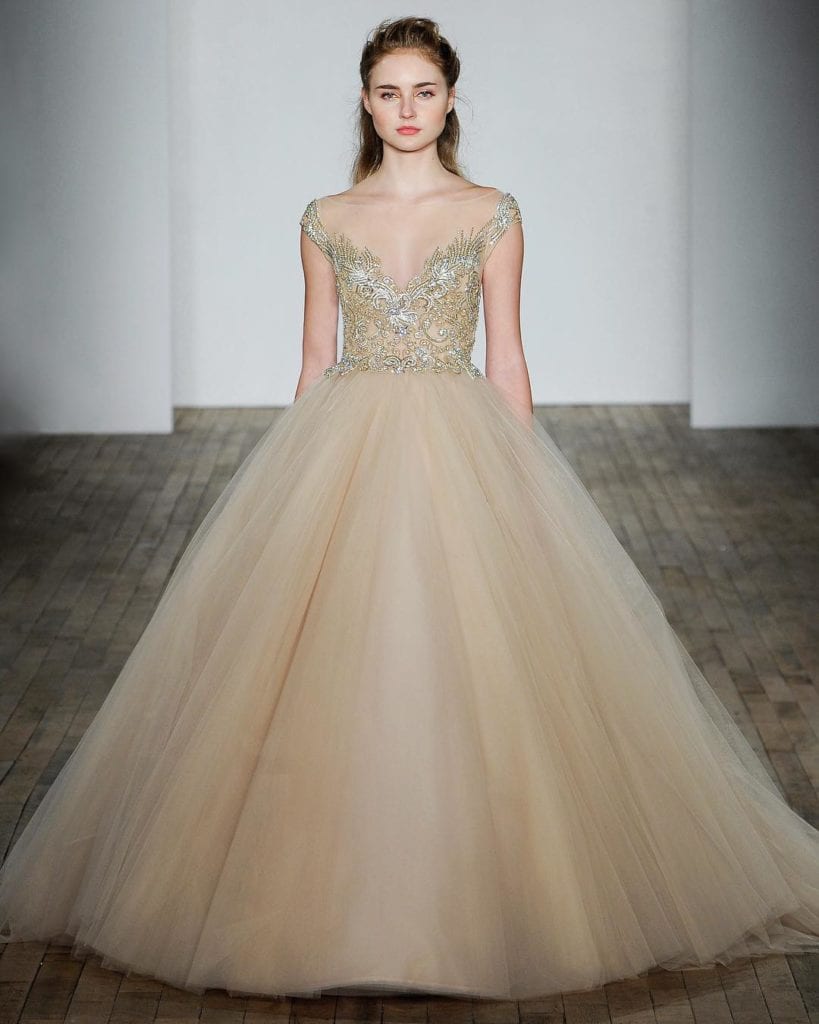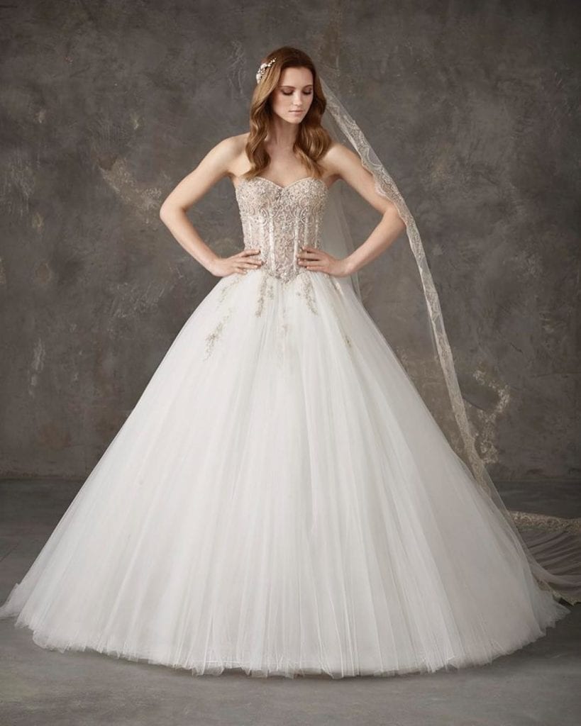 Самый часто украшаемый элемент платья – корсет. Есть много возможностей. Вниз классическая принцесса с красивым подолом из тюля, топы в полный рост прекрасно сидят камни большего или меньшего размера. Некоторые дизайнеры создают ювелирные «паутинки», которые не обязательно видны издалека — только вблизи мы можем оценить их волшебство и мастерство.