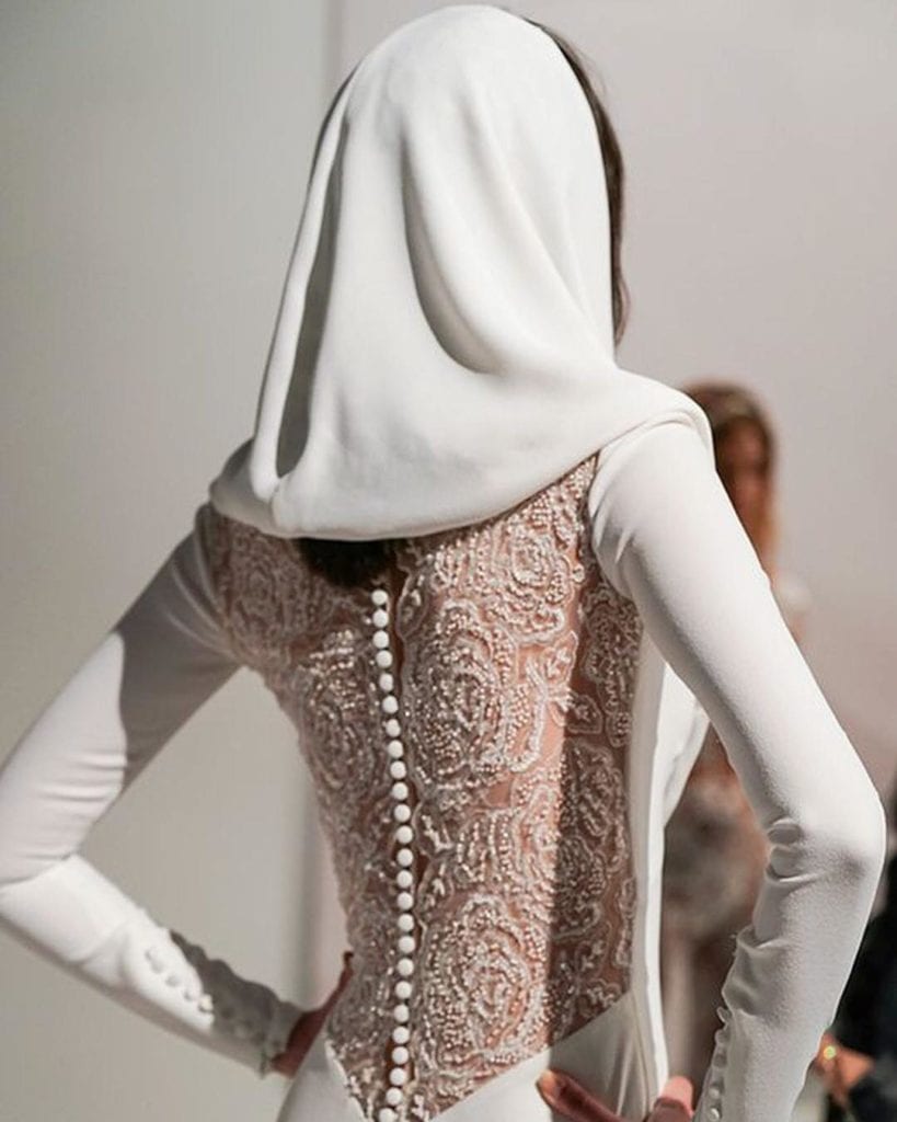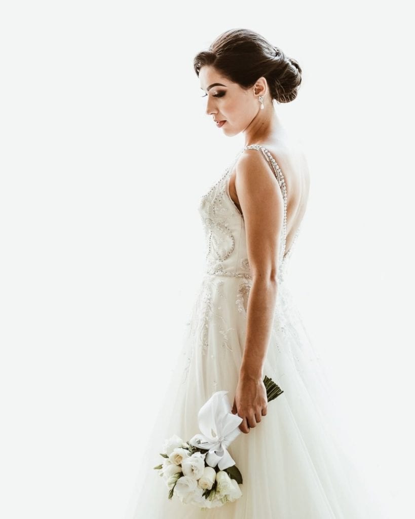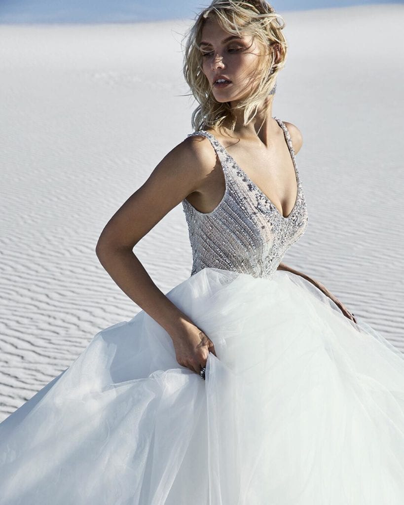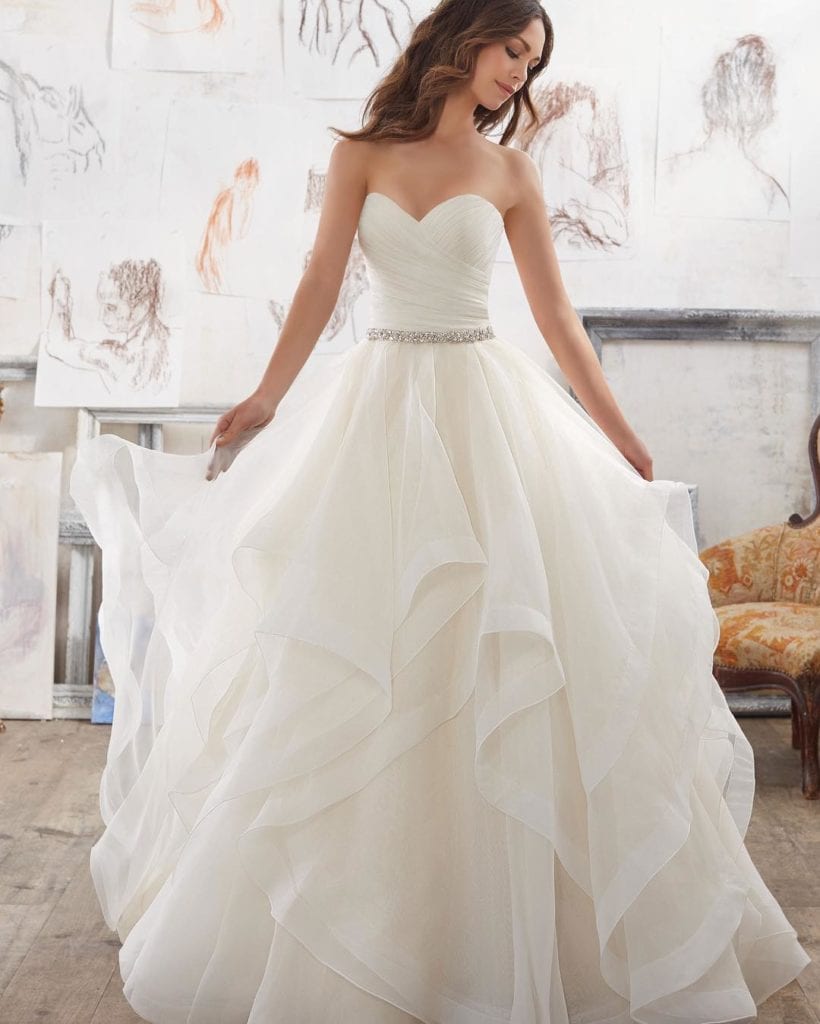 Самый часто украшаемый элемент платья – корсет. Есть много возможностей. Вниз классическая принцесса с красивым подолом из тюля, топы в полный рост прекрасно сидят камни большего или меньшего размера. Некоторые дизайнеры создают ювелирные «паутинки», которые не обязательно видны издалека — только вблизи мы можем оценить их волшебство и мастерство.